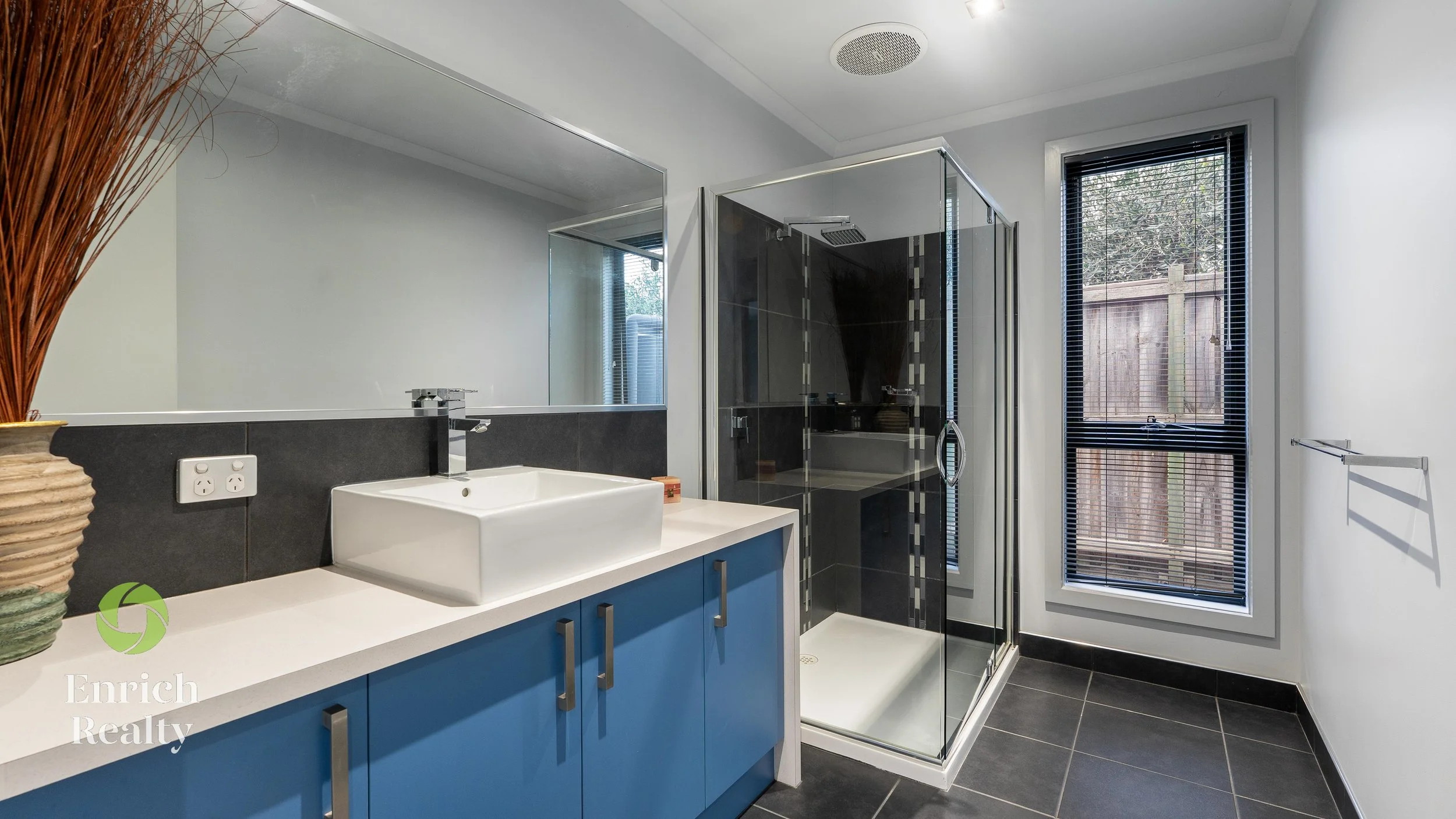 A separate powder room, a main bathroom with shower and single vanity, and a large laundry with excellent storage complete the interior. The home also features a split-level design between the kitchen and the second living area, adding a unique architectural touch.